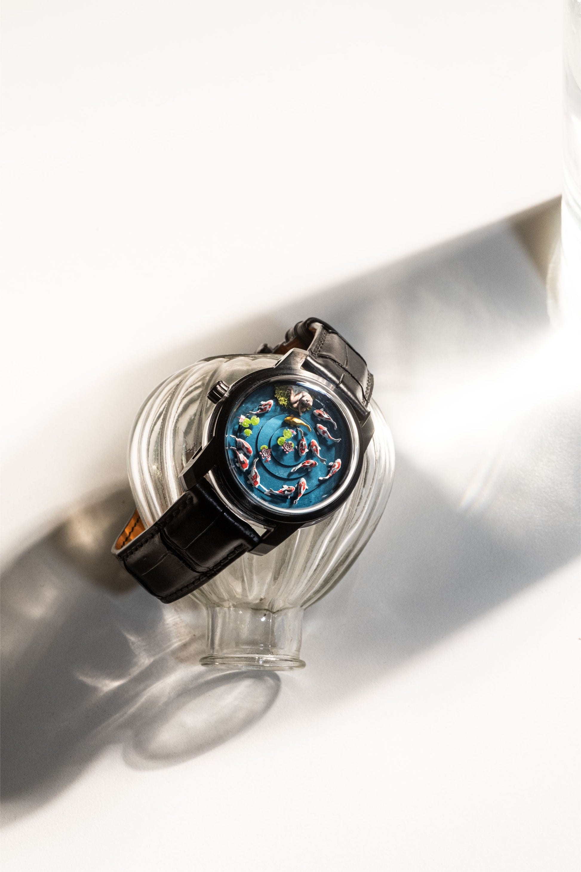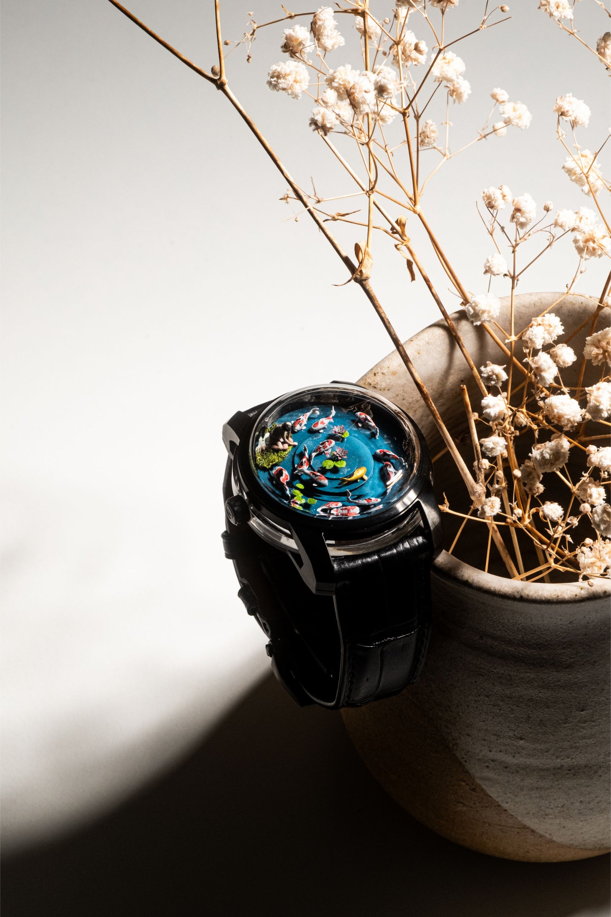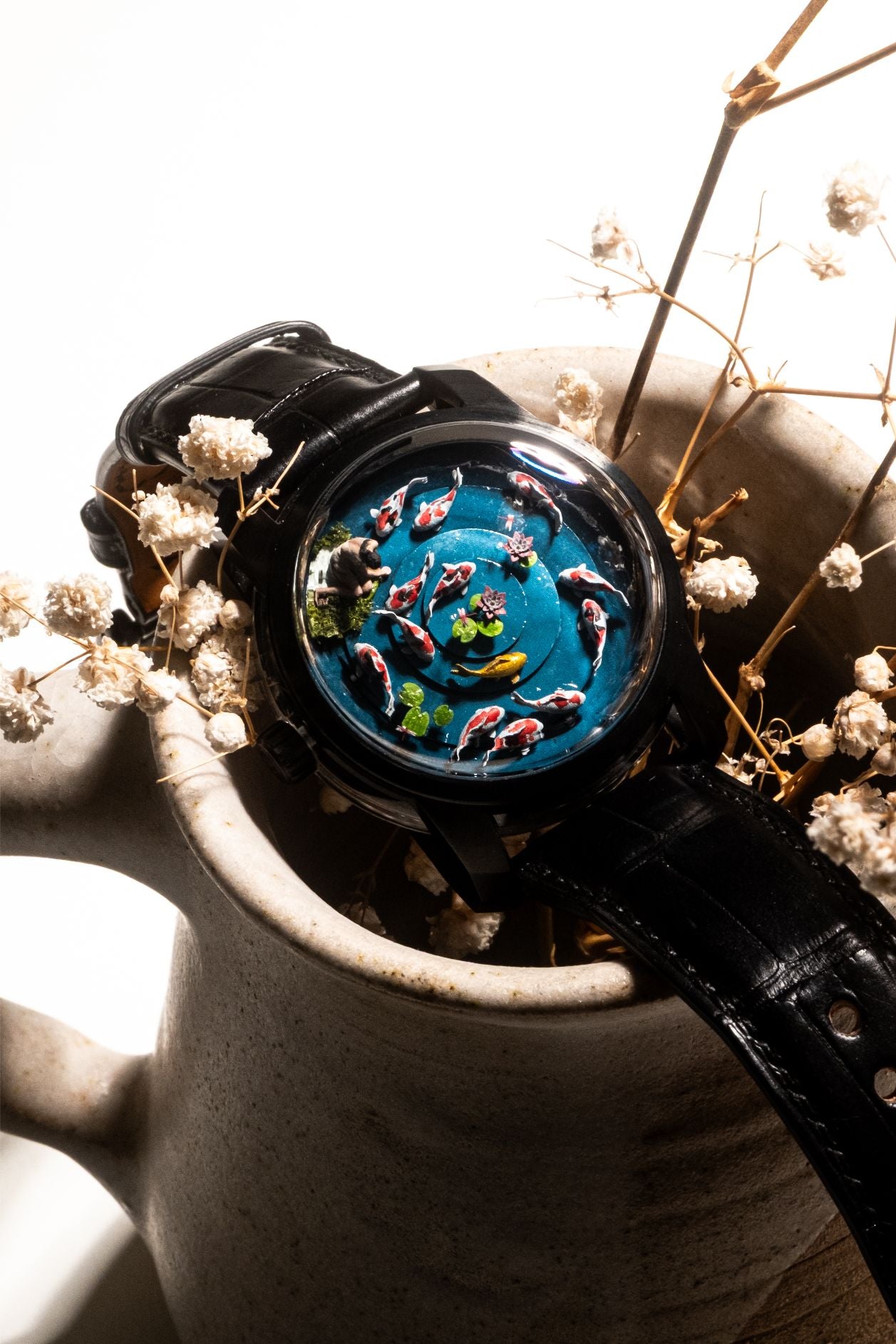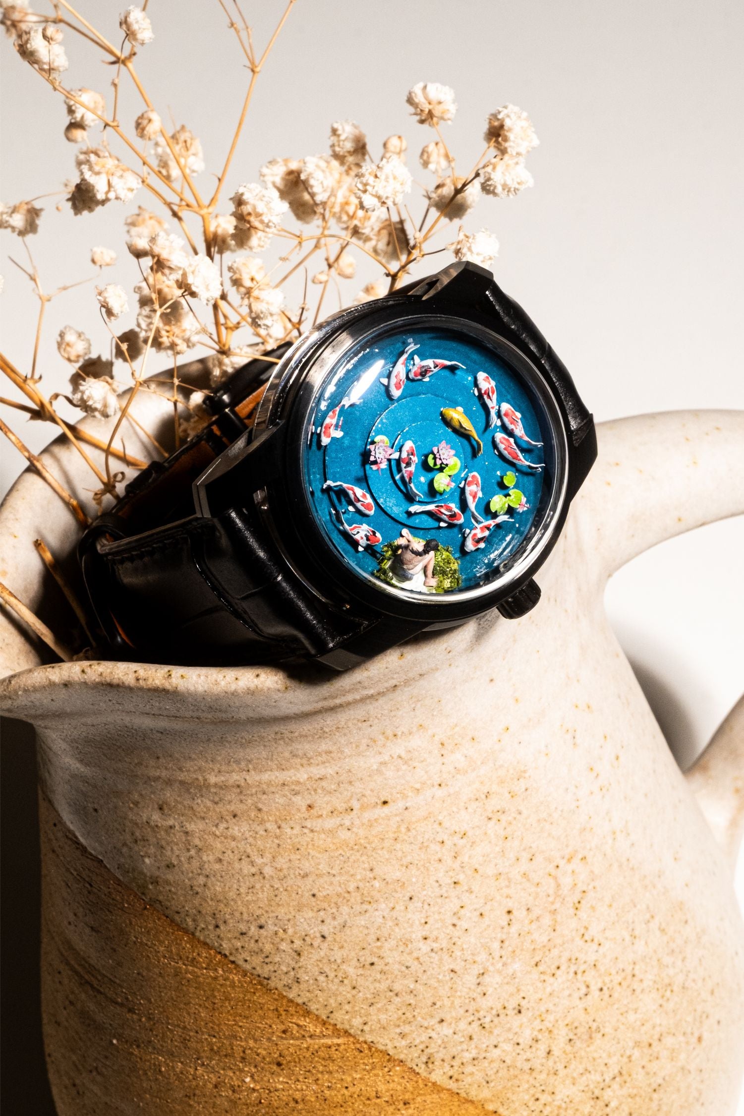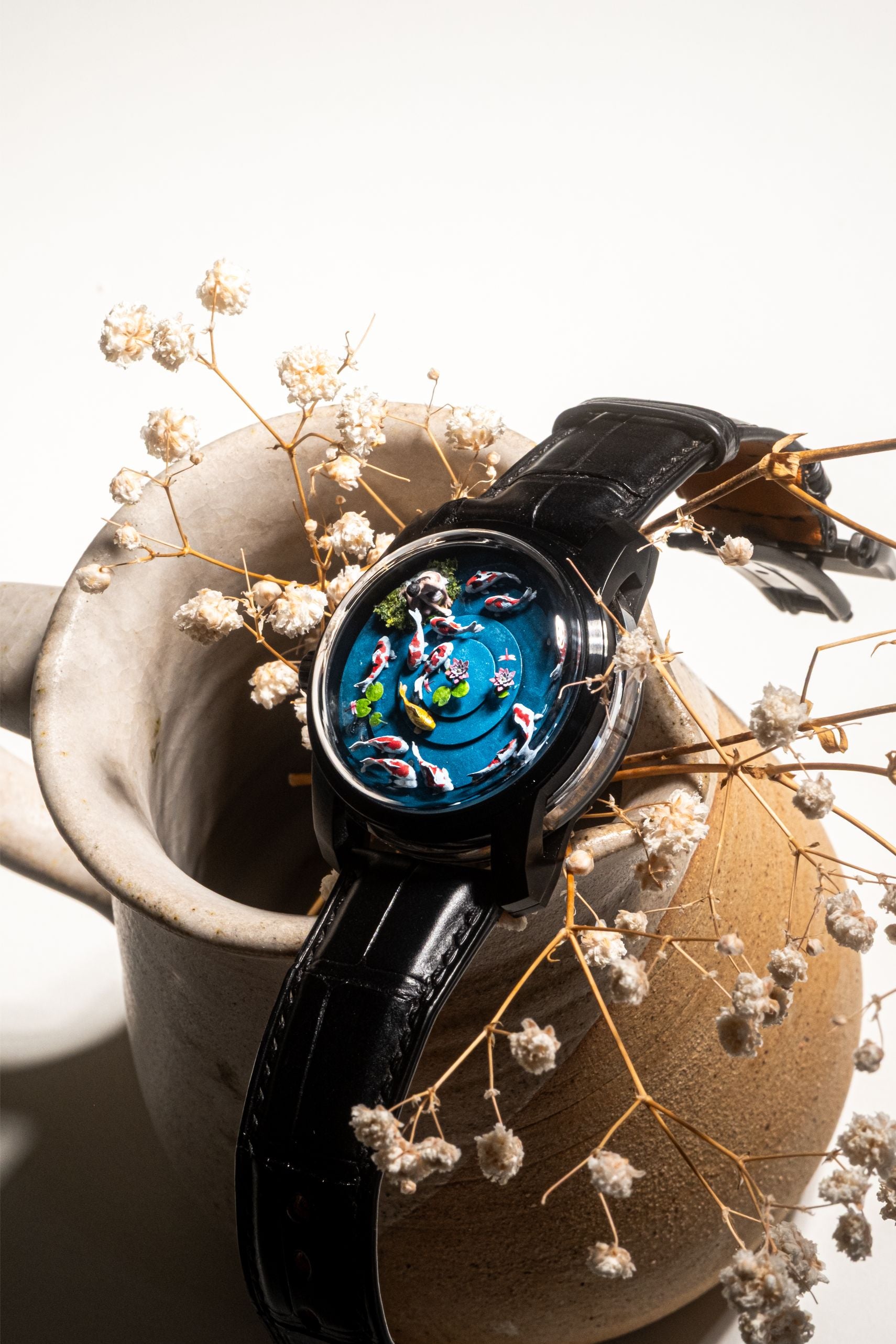 This signature piece of artwork required expert craftsmanship and thorough precision. The bright blue backdrop captures the eye with its vibrancy, drawing the viewer into a layered scene of stillness and life. On the outermost dial, the geisha sits gracefully in a pale white dress, leaning toward the water’s edge as she feeds the koi. Her presence sets the serene tone, inviting the gaze inward. While on the second dial, white and red Kohaku koi swirl in gentle motion, their patterns bringing warmth and rhythm to the composition. They encircle the centre, guiding the eye toward its heart. At the centremost dial, a single golden koi takes its place in quiet prominence. It glimmers against the surrounding blues, symbolizing patience, luck, and the reward that comes from enduring stillness.