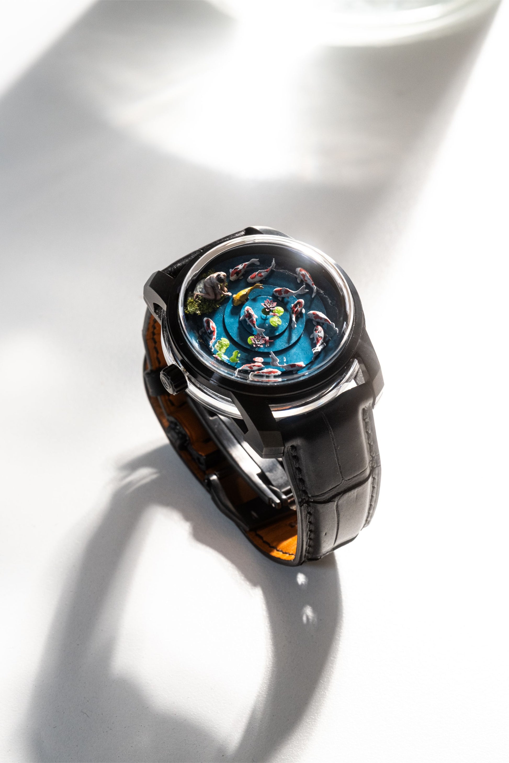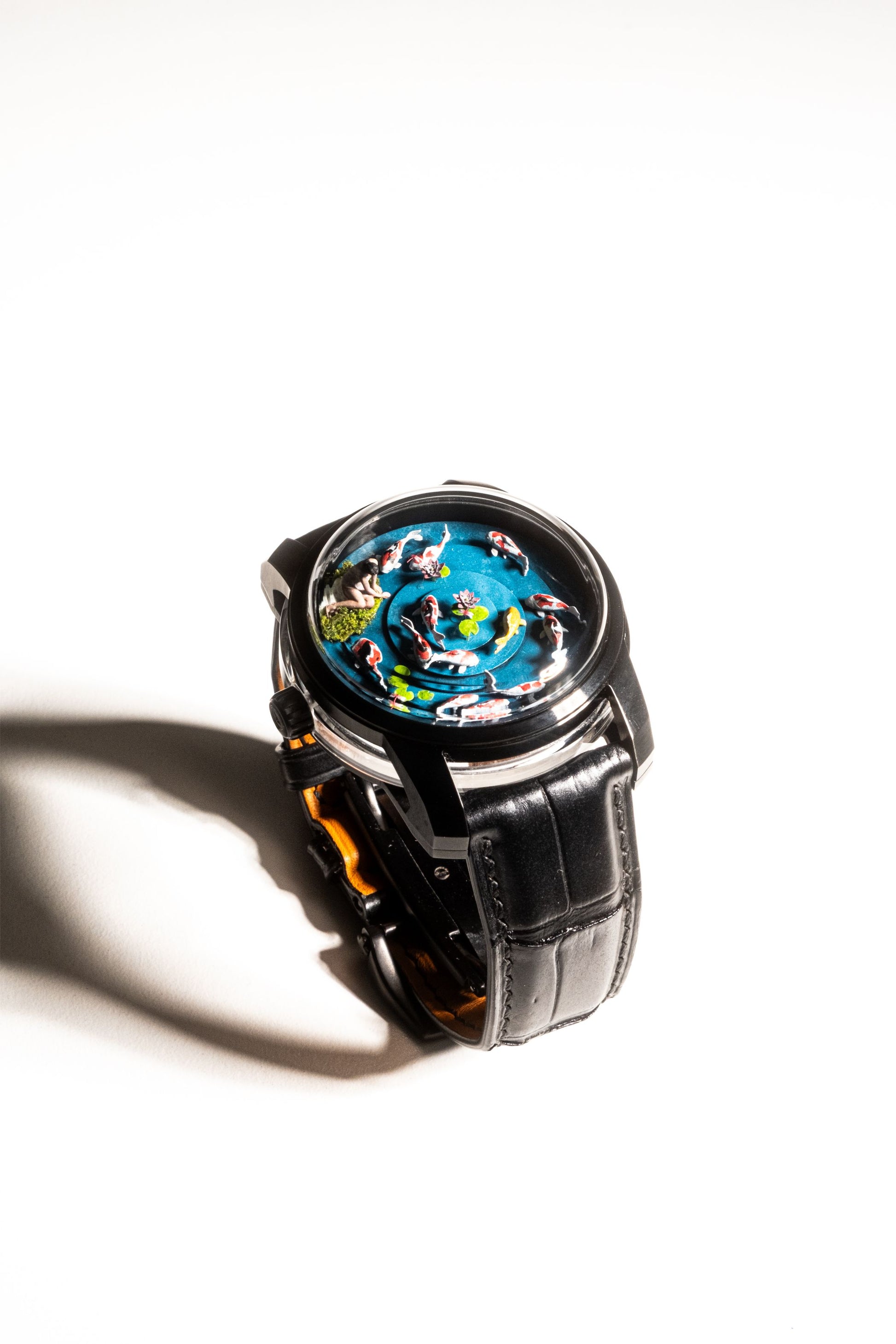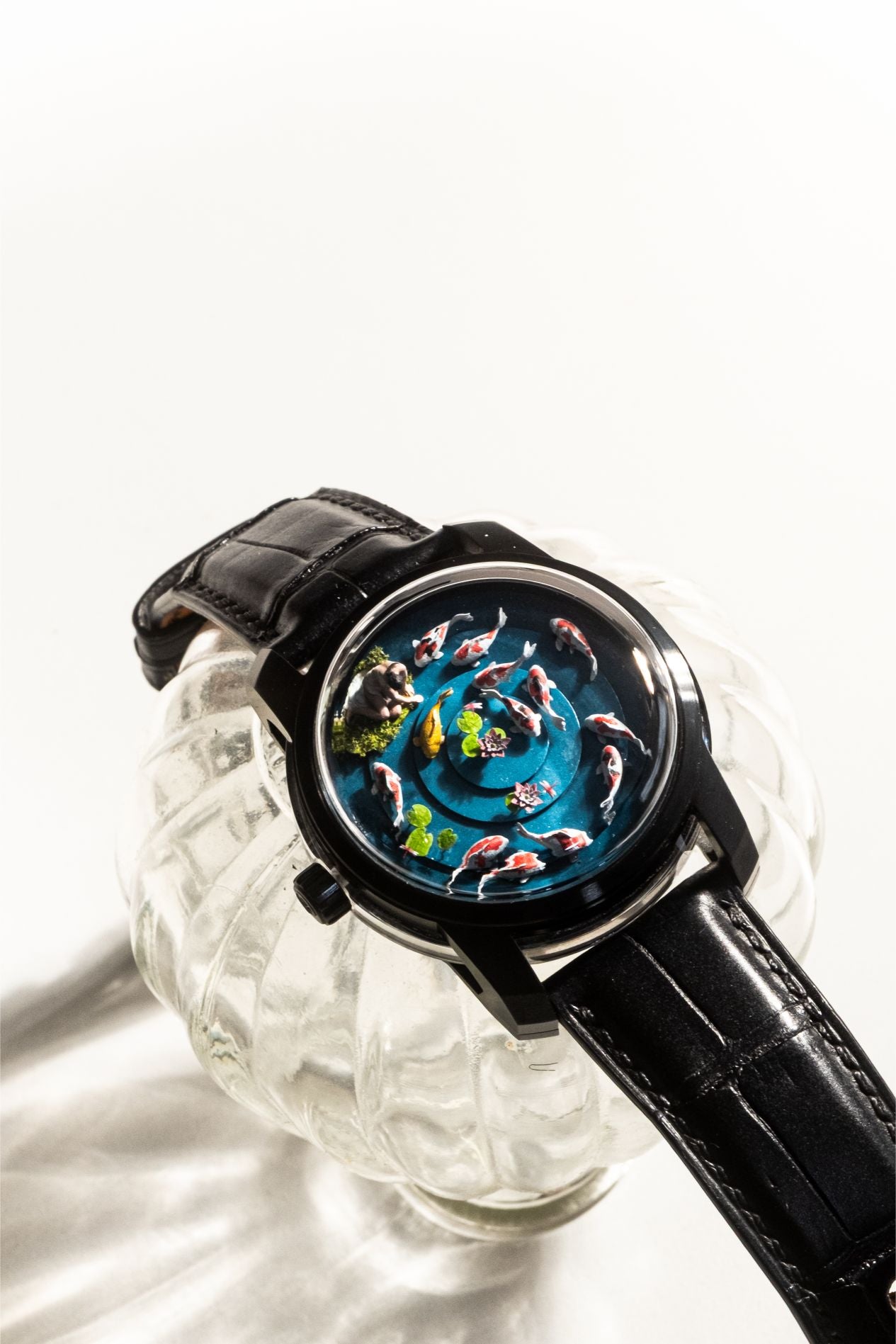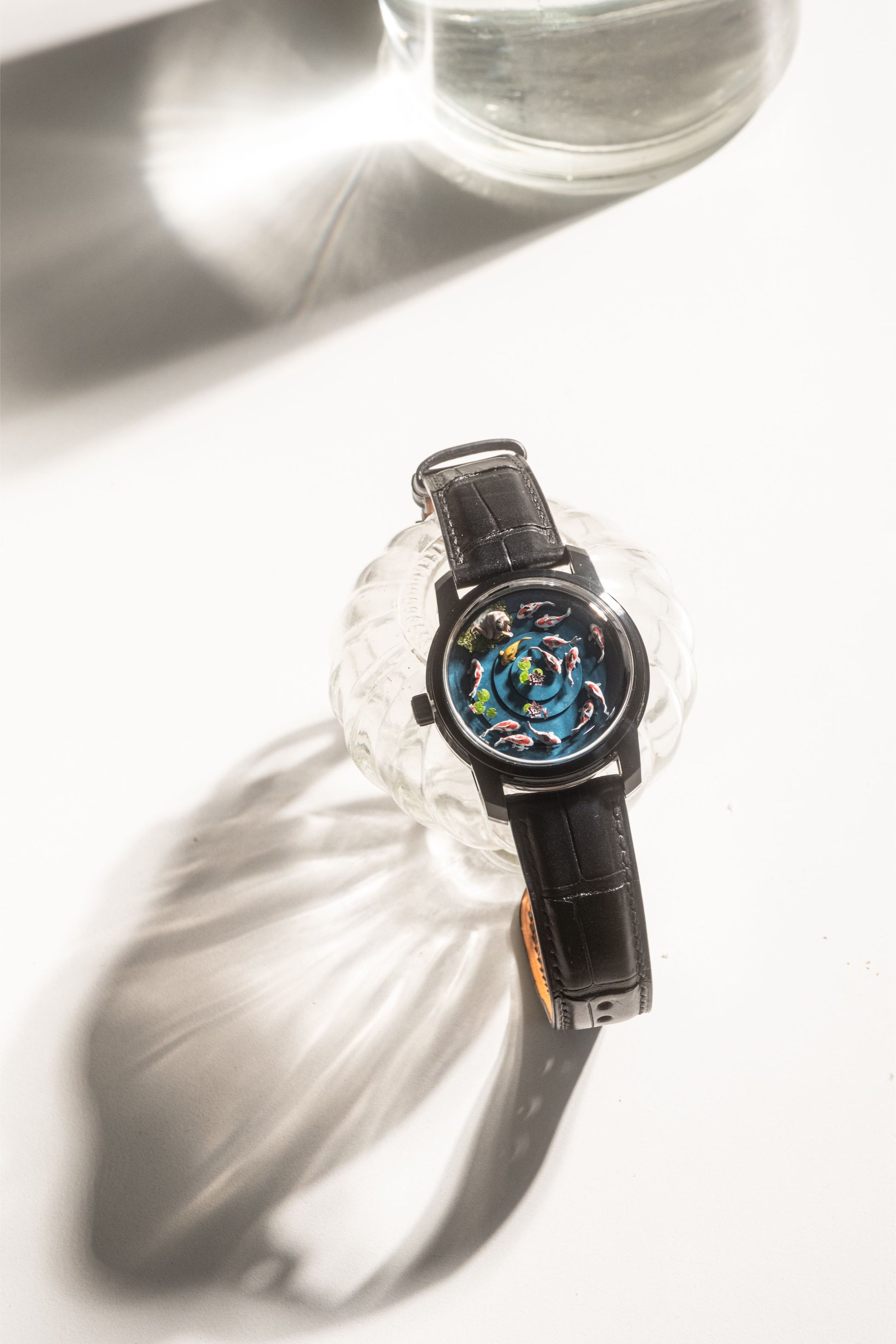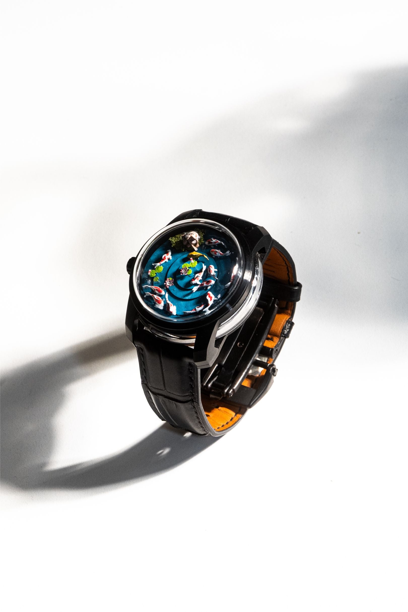 This signature piece of artwork required expert craftsmanship and thorough precision. The bright blue backdrop captures the eye with its vibrancy, drawing the viewer into a layered scene of stillness and life. On the outermost dial, the geisha sits gracefully in a pale white dress, leaning toward the water’s edge as she feeds the koi. Her presence sets the serene tone, inviting the gaze inward. While on the second dial, white and red Kohaku koi swirl in gentle motion, their patterns bringing warmth and rhythm to the composition. They encircle the centre, guiding the eye toward its heart. At the centremost dial, a single golden koi takes its place in quiet prominence. It glimmers against the surrounding blues, symbolizing patience, luck, and the reward that comes from enduring stillness.
