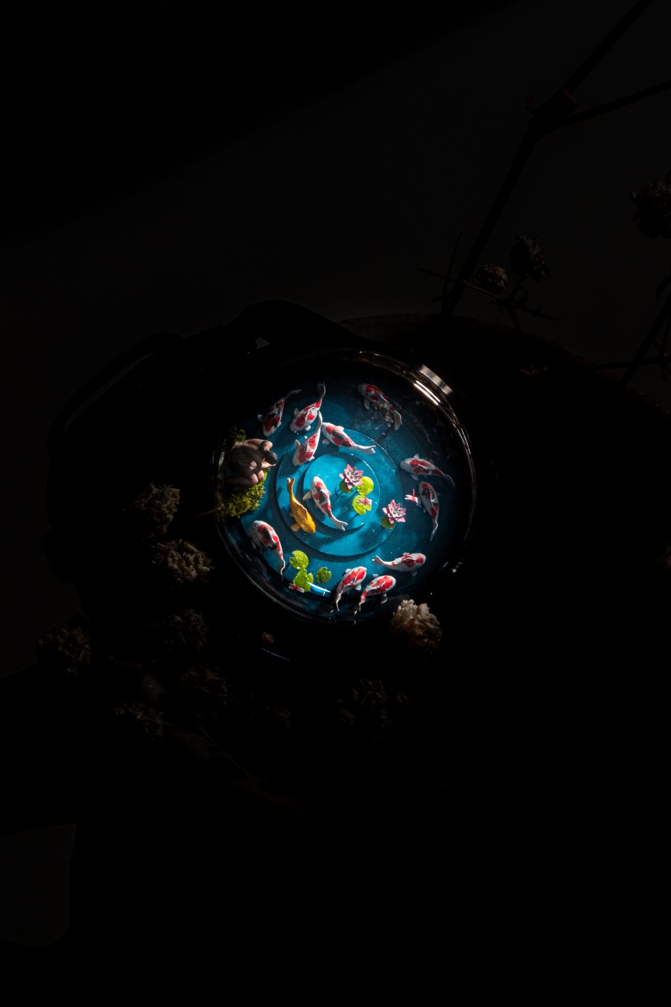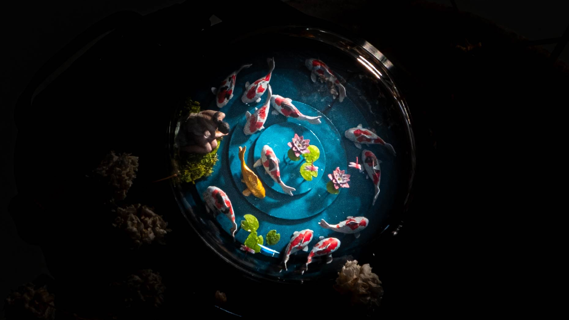 A beautiful geisha sits alone, waiting by the water garden for her lover, her only company being the school of koi fish swimming below. Will her lover arrive, or is she destined to remain alone forever? ‘Koibito’ is the Japanese word for “lover” or “the person you love.” Is the love she seeks that of another, or will she fill that void with the love she finds within herself? As she admires the tranquil atmosphere around her, a hint of loneliness lingers. Yet the bright colours surrounding her paint the opposite emotion. The pond shimmers with an iridescent ocean-blue sheen, acting as a physical embodiment of the peace we find within. It is the picture-perfect essence of calm stillness. The melancholy ambience is overturned by the vibrancy of life breathed into this sculptural painting.