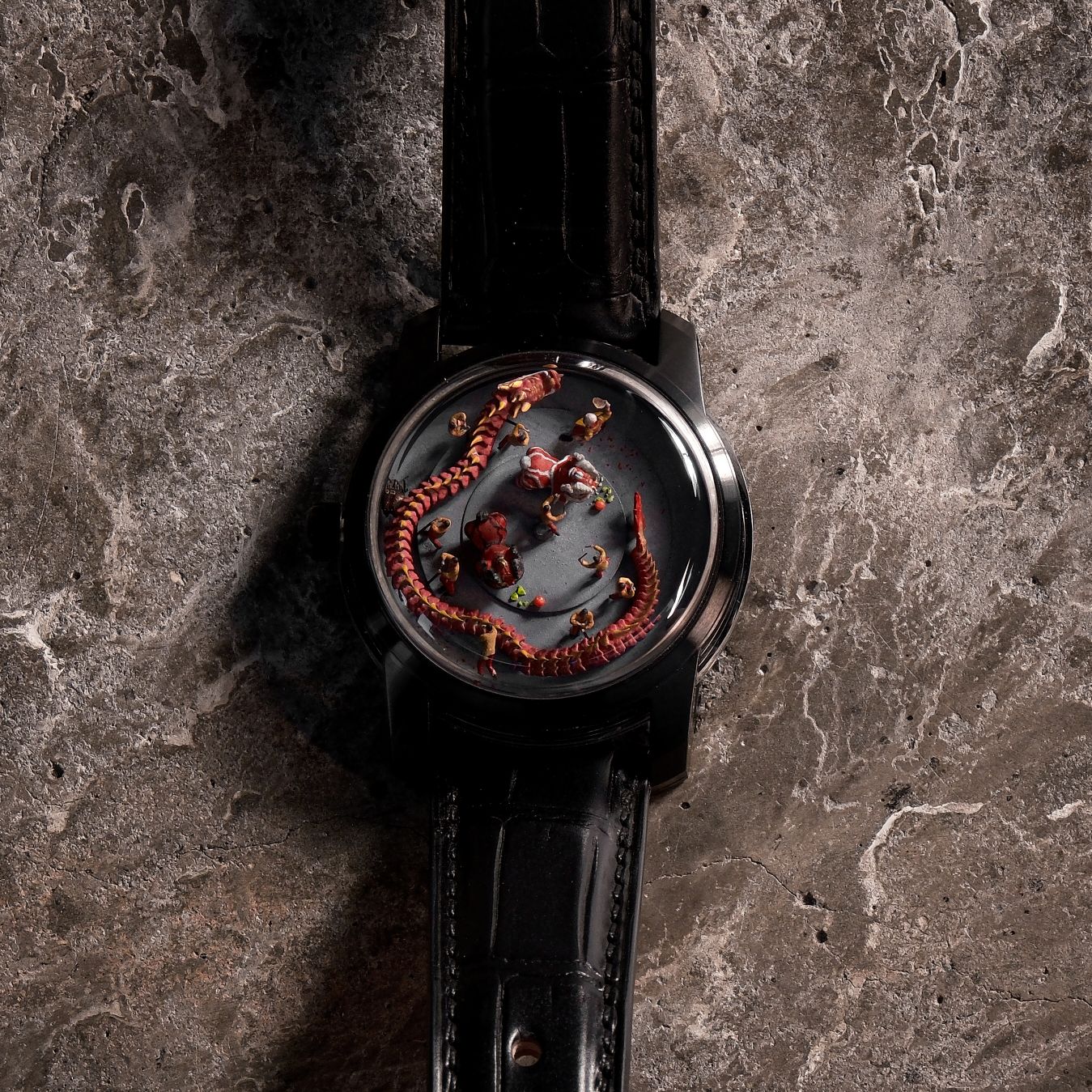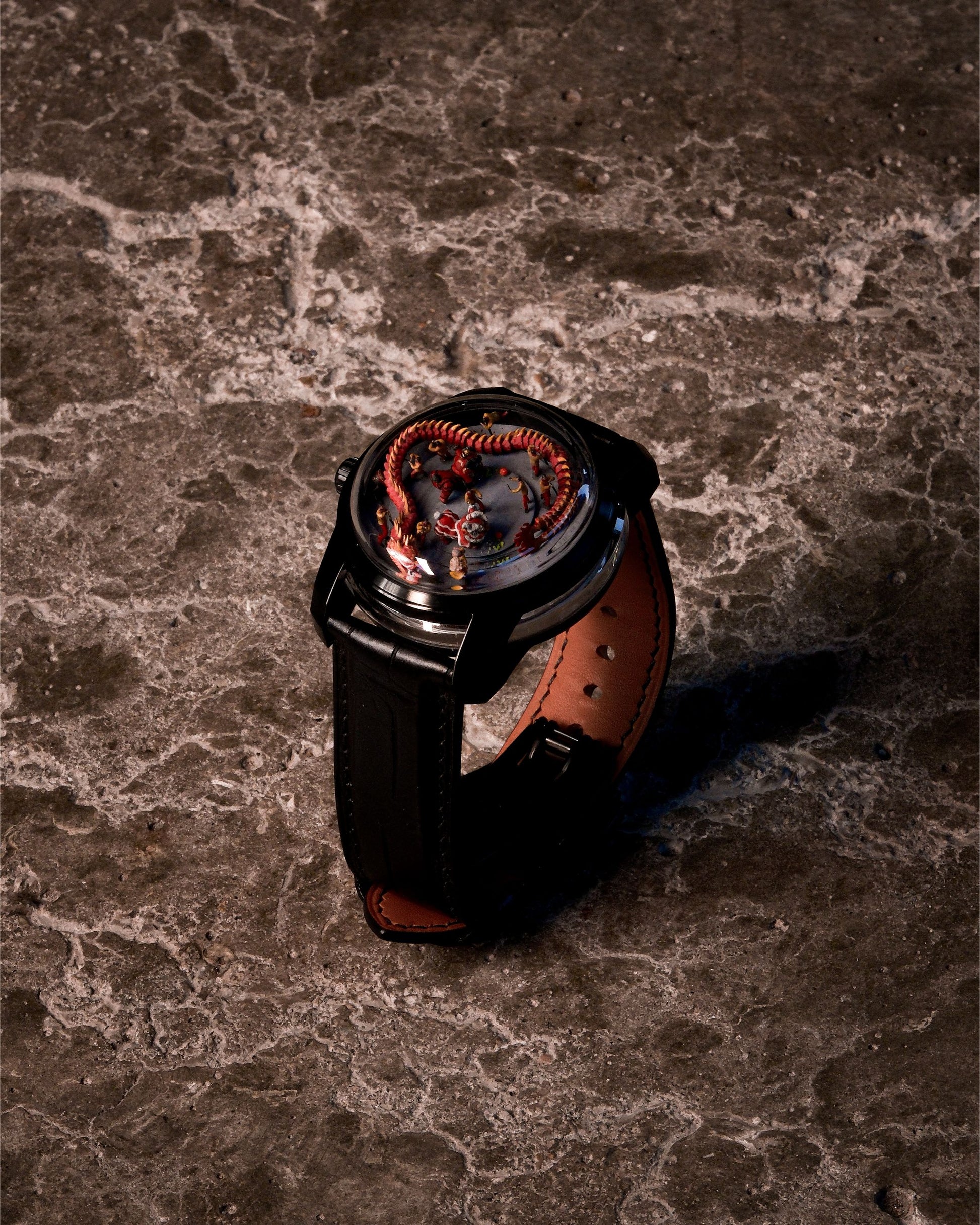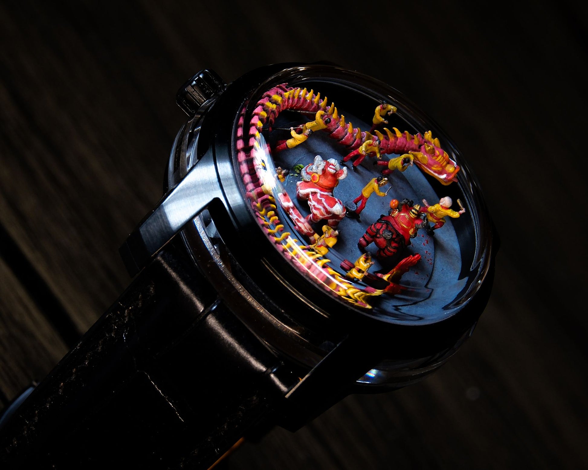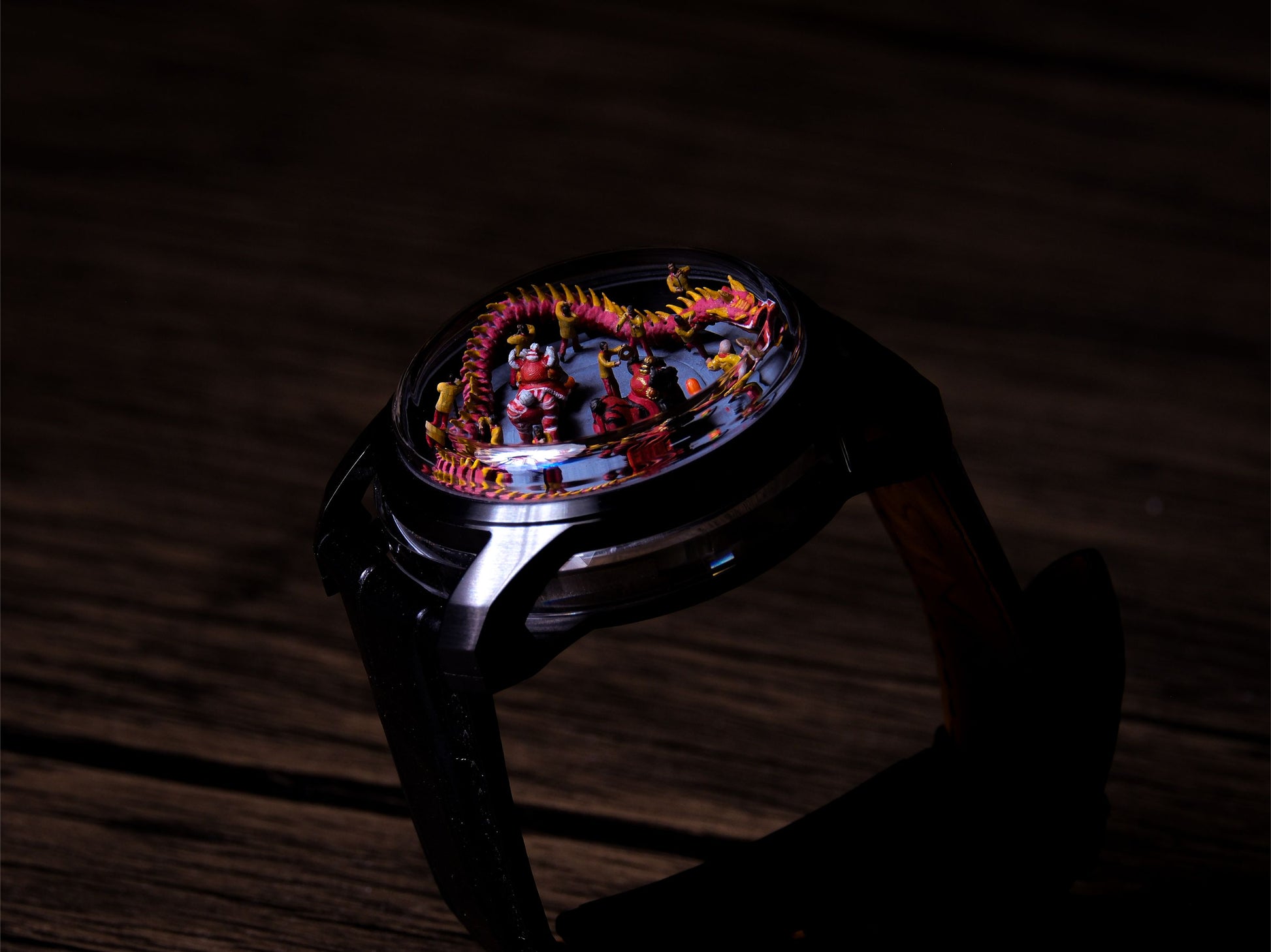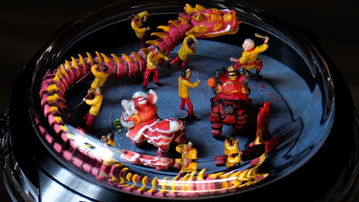 The impressive mixture of acrobatic excellence along with vibrant movements all while following the rhythmic beats of the drum. Let the energy of these ritual dances flow through you with our recapturing of an ancient tradition. Two lions can be seen in the middle surrounding the centre dial that hosts a single performer playing the “tian ling” (the heavenly bell). The entire scene is then encompassed by a group of corresponding performers guiding the long red dragon that circles the mystical event. The beaming colours of red and yellow shines through grasping our curiosity. The entire scene sits on a grey background that aids in accentuating the colours of each sculpture.