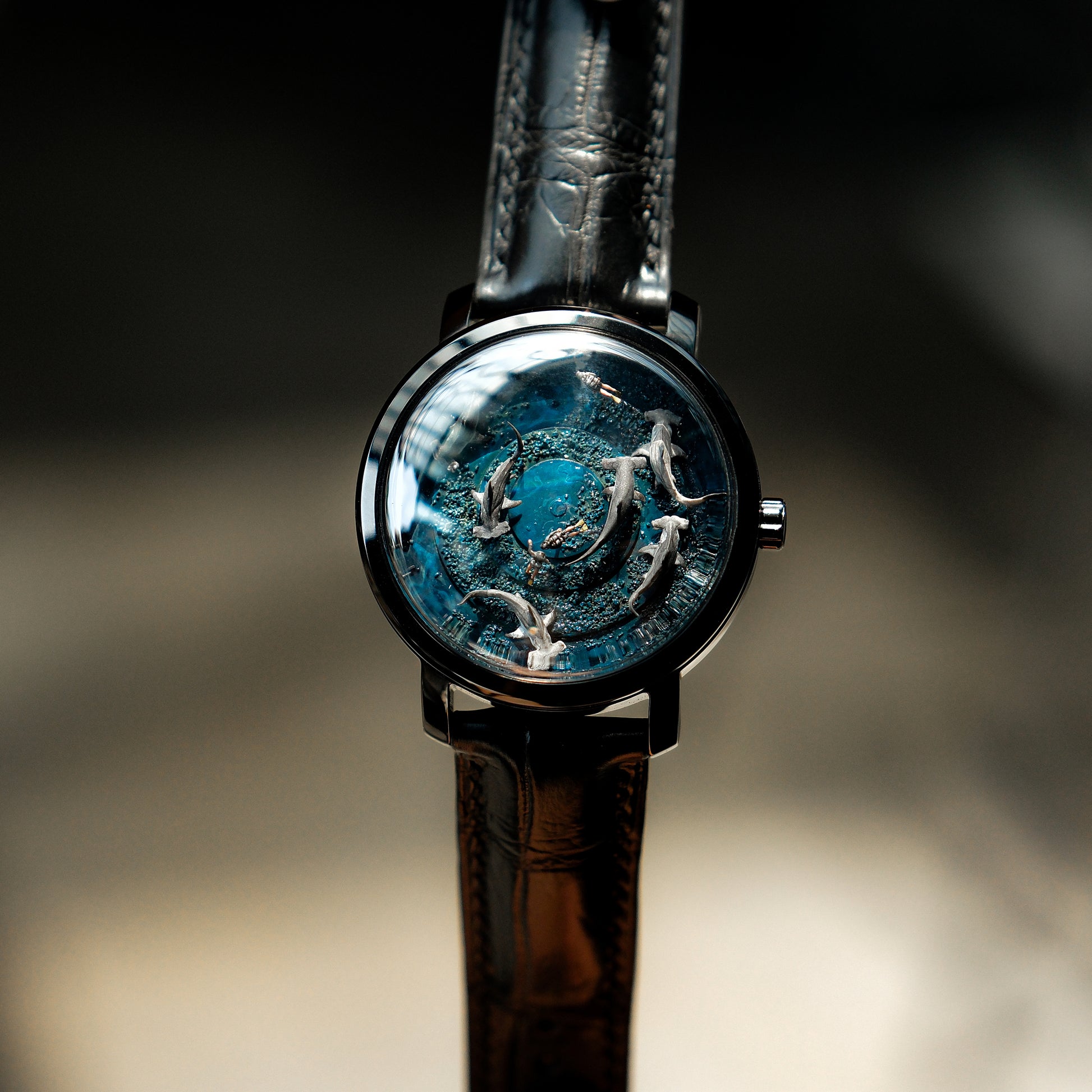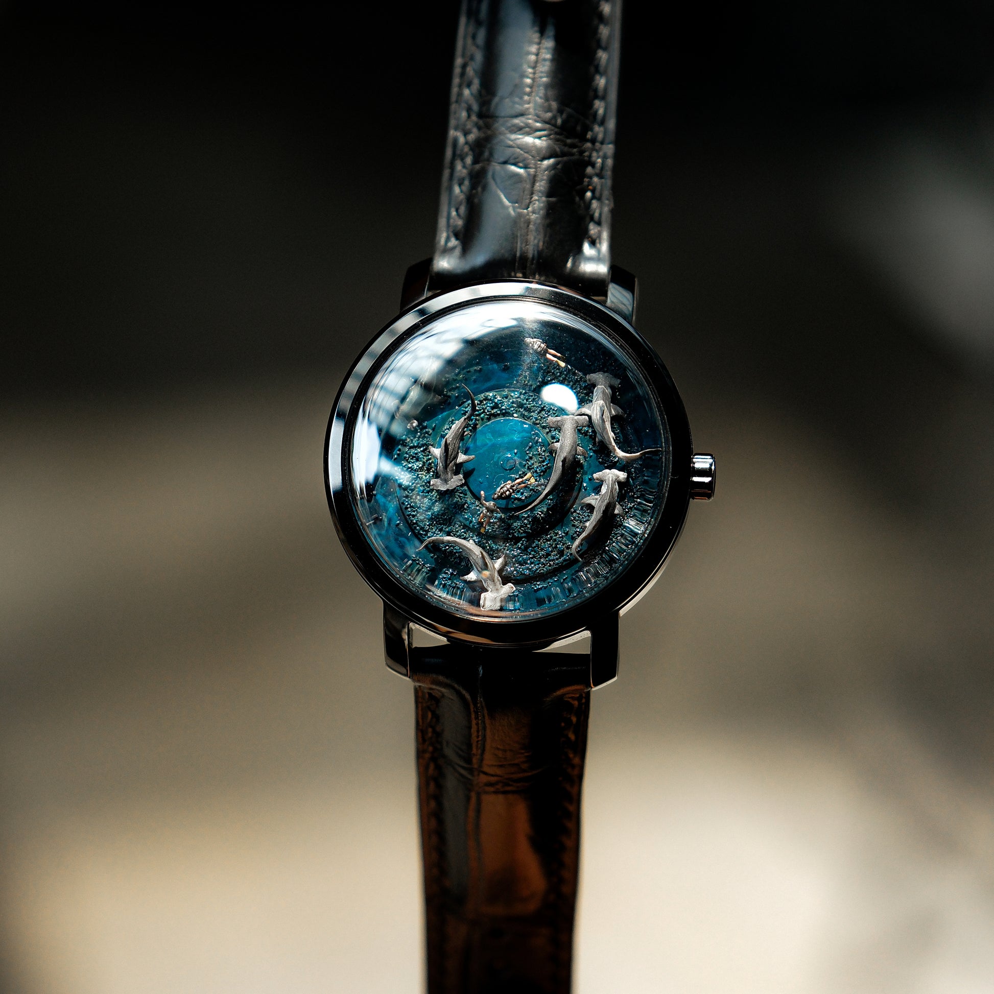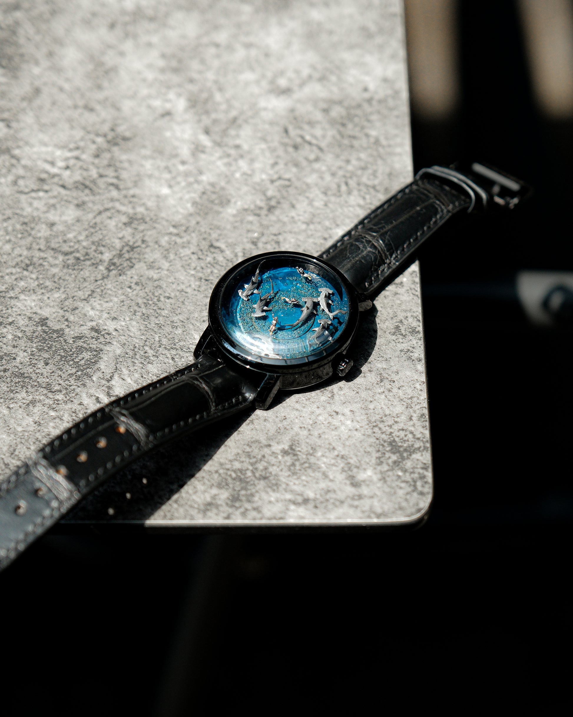 The beauty of humanity is the willingness to take a leap of faith in the pursuit of growth. What would you do? Play it safe? Or put everything on the line in the pursuit of progress? This watch stands as a reminder to be brave and smart when taking chances. Calculated risks are the pillars of progress. The divers are a testament to the lengths humanity has gone to gain knowledge. The blue background is darkened with the addition of greyish black rocks to simulate an ominous setting on the shallow waters the hammerheads and divers find themselves in. The majority of the sharks sit on the outer dial with a total of four of them swimming by every hour. The middle dial houses the remaining two sharks that are much faster than the rest of the group as they circle the dial every minute around the very active diver in the centremost piece. The diver accurately moves with each passing second.