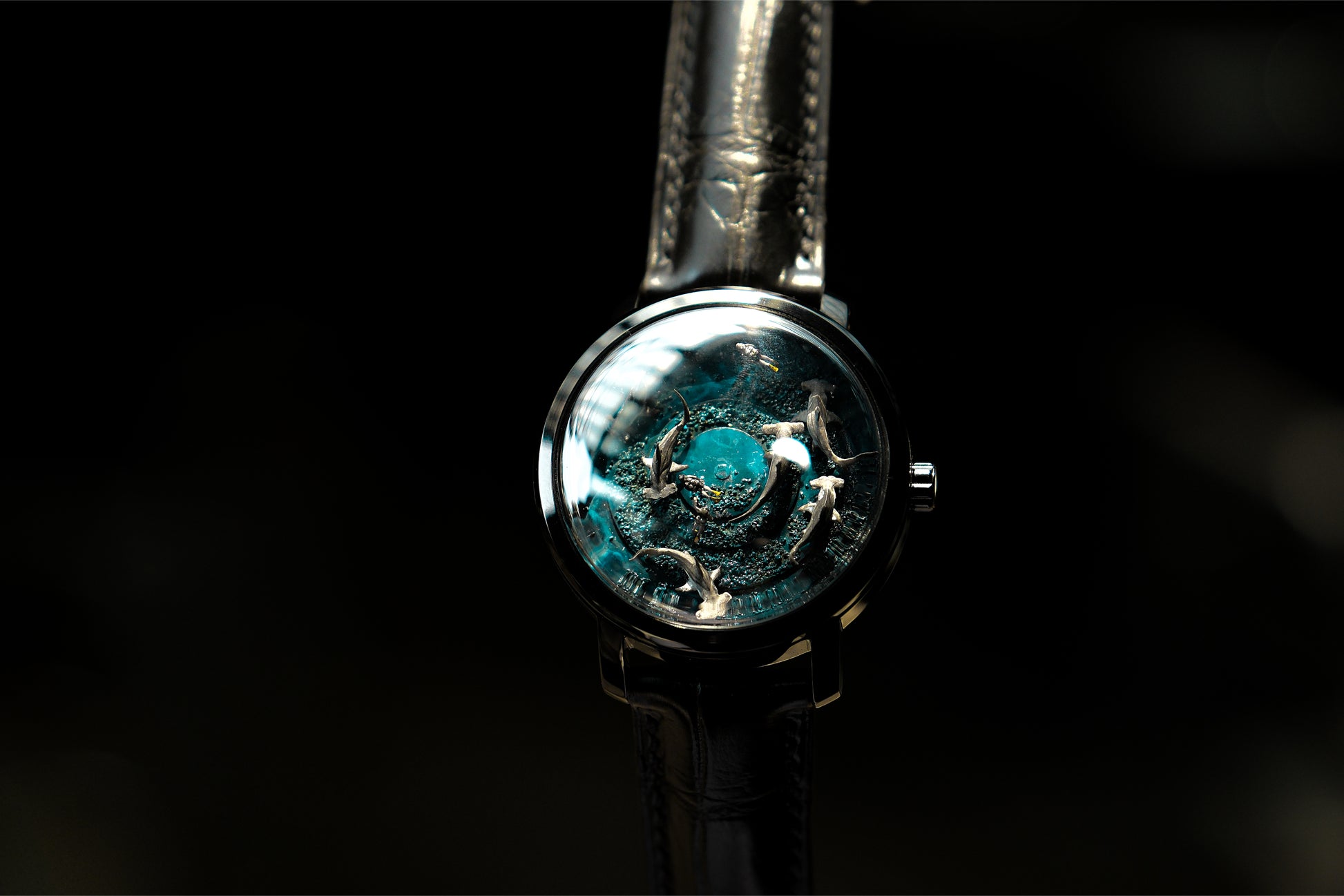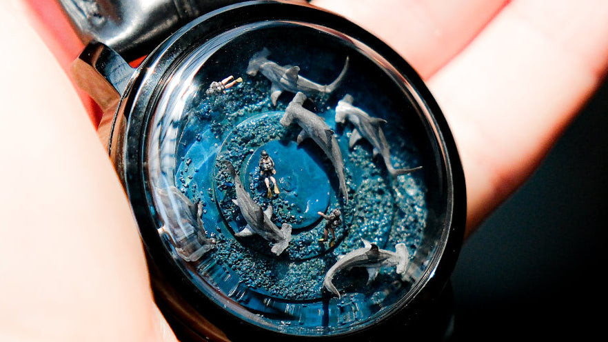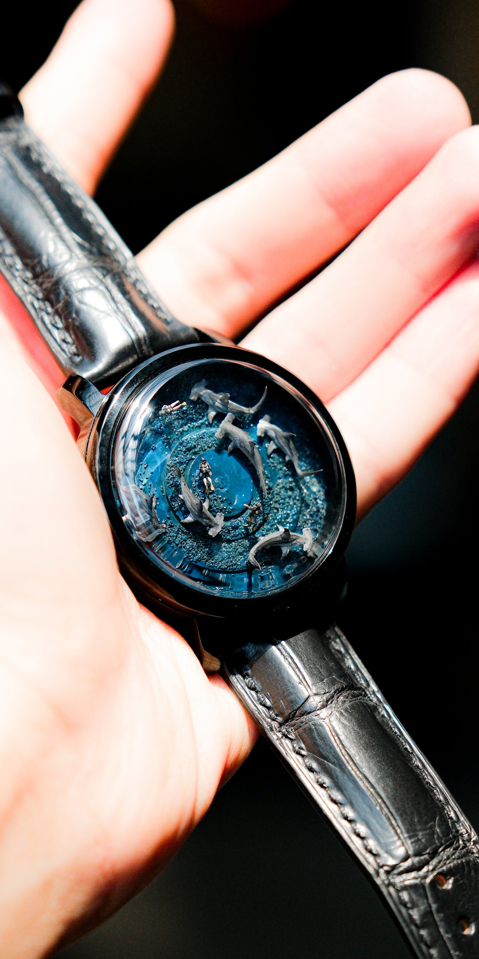 The beauty of humanity is the willingness to take a leap of faith in the pursuit of growth. What would you do? Play it safe? Or put everything on the line in the pursuit of progress? This watch stands as a reminder to be brave and smart when taking chances. Calculated risks are the pillars of progress. The divers are a testament to the lengths humanity has gone to gain knowledge. The blue background is darkened with the addition of greyish black rocks to simulate an ominous setting on the shallow waters the hammerheads and divers find themselves in. The majority of the sharks sit on the outer dial with a total of four of them swimming by every hour. The middle dial houses the remaining two sharks that are much faster than the rest of the group as they circle the dial every minute around the very active diver in the centremost piece. The diver accurately moves with each passing second.